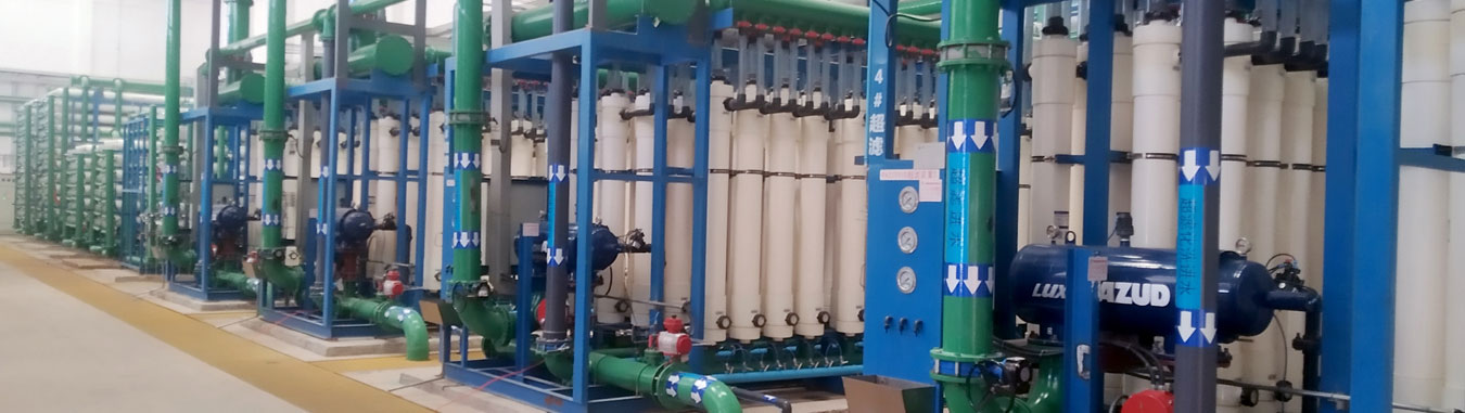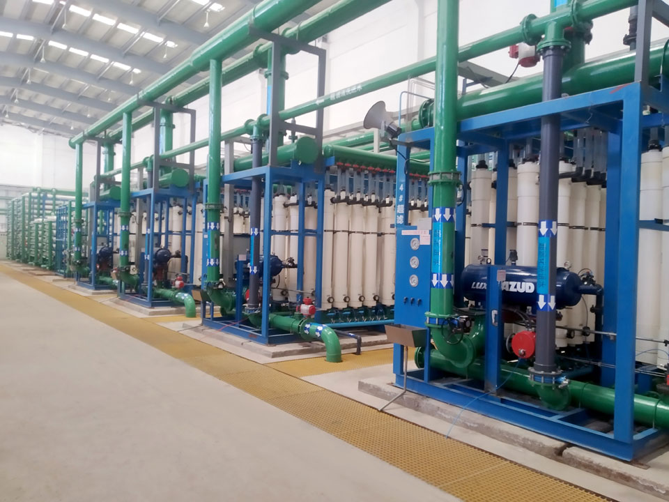 “超濾膜+反滲透膜”是目前以反滲透膜為核心工藝最常用的水處理工藝流程,超濾(UF)是以壓力為驅動(dòng)的膜分離過(guò)程,它能夠將顆粒物質(zhì)從流體及溶解組份中分離出來(lái)。超濾膜的典型孔徑在0.01-0.1μm之間,對于細菌和大多數病菌、膠體、淤泥等具有極高的去除率,作為反滲透的預處理系統,處理效果穩定,對污染物去除率高,對反滲透系統起到很好的保護作用。反滲透系統則利用其良好的脫鹽性能,去除水中的各種溶解性離子,產(chǎn)水達到回用標準。
